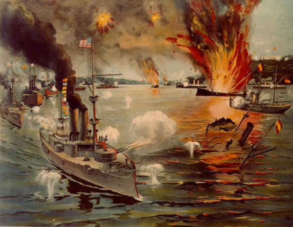 “In 1898 the American battleship USS Maine blew up in Havana, Cuba (another Spanish colony). Washington blamed Spain for the provocation; Spain denied it all, to no avail. The Spanish-American war began on April 25th.”