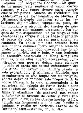 In 1898 the American battleship USS Maine blew up in Havana, Cuba (another Spanish colony). Washington blamed Spain for the provocation; Spain denied it all, to no avail. The Spanish-American war began on April 25th. Only four days before, Luis Cadarso wrote back to his elder brother Alejandro Cadarso (who was married to my great-great-great-grandmother’s first cousin) about the tight situation: “My dear brother, the French mail ship leaves to-morrow and I only have time to write but four lines. Last night we received cablegrams from the [Spanish] Navy and Overseas Ministers, stating only that diplomatic relations [with the United States] had been broken off; we are therefore awaiting the declaration of war any time now, which is why we are preparing all our battleships we have here. Mine [the Spanish battleship Reina María Cristina] is already on stand, with its spars and masts down, and everything painted grey, prepared to go into combat. As you well know, this ship has six guns, but nothing to protect its hull, so anything that hits us will inevitably cause damage to the ship. But even so, and despite the American Navy having six ships in the bay at Hong Kong (for of them armour-plated), we will do our duty, for it has always been the creed of the Cristina‘s commander [Cadarso himself] never to lower her flag, and only by Admiral Montojo giving such an order, who will soon board this ship with his insignia, could I cease to follow this creed. I am leaving poor Petronila under the care of the Mother Superior of Santa Isabel school; with the Isla de Cuba, Isla de Luzón, Cristina and Castilla (wooden ship), we are going to defend Subic’s arsenal and turn later, according to the circumstances. Farewell, greet all those great relatives and friends with affection, and receive a heartfelt hug from your brother, Luis”.