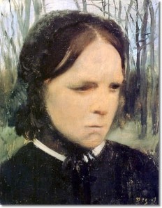 Hilaire’s next son was Auguste, Edgar’s father. Auguste decided not to marry a rich Italian heiress, but instead found happiness in a French-American lady when he married Celestine Musson in 1832 in Paris. Celestine had plenty of relatives in New Orleans, and indeed several of her children spent long periods in Louisiana. Her youngest son, René de Gas, married her widowed niece Estelle Musson Balfour, whom he abandoned (together with their large brood of children) to marry someone else. Edgar Degas (who always used the unpretentious version of the family surname, as if dropping his aristocratic aspirations) took pity on poor Estelle, and painted her several times during one long visit to America, when she was almost blind.