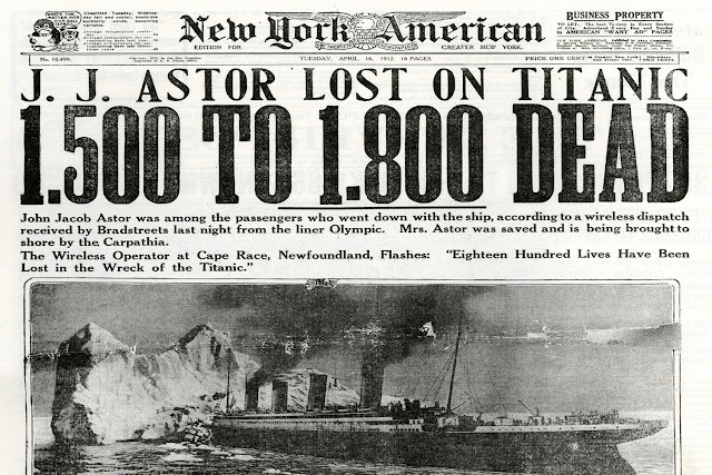 A rather sensationalist and inaccurate portrayal of the sinking shortly after the sinking, depicting the ship directly ramming an iceberg. Note that the exact death toll was still unknown.
