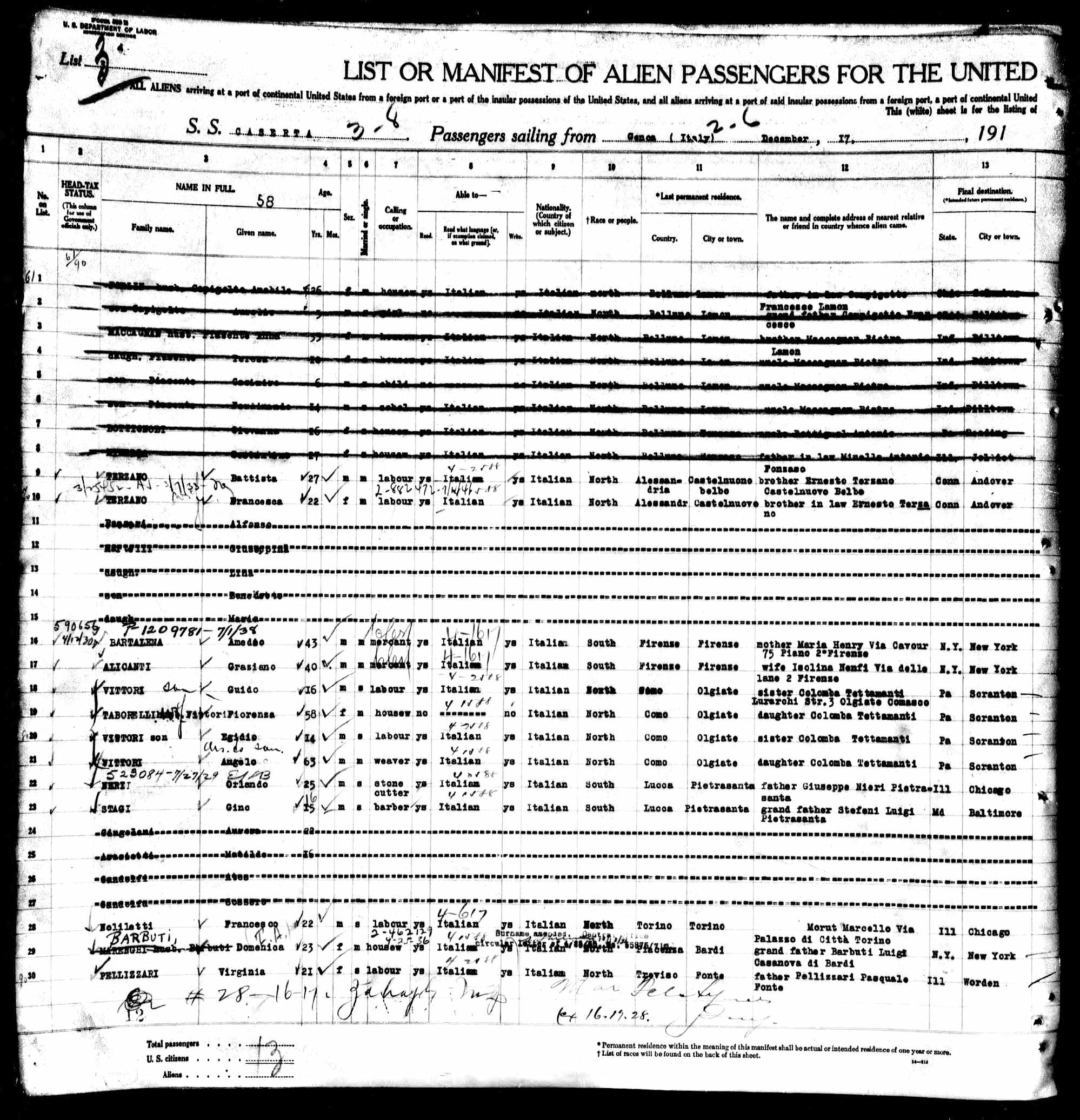 My great-grandfather left the US at least once again in September 1923, three years after the untimely death of his young wife, who passed away aged just 24. He returned to America in 1924 but left again shortly afterwards to marry in Italy for a second time. He became a naturalised American citizen in 1927 (the passenger list for this trip re-entering the US after his second wedding is missing) and a few months after, his wife joined him in New York. His son, my grandfather, had been sent back to Italy in 1920, the same year his mother died, in all probability to be raised by the child’s paternal grandmother. He too joined his father and step-mother in 1928, when he was already aged 12; the passenger list confirms the year when he left America. To a young boy like him, leaving the provincial village in Italy to resume his life in America with his father must have been an overwhelming experience. But that’s another story…
