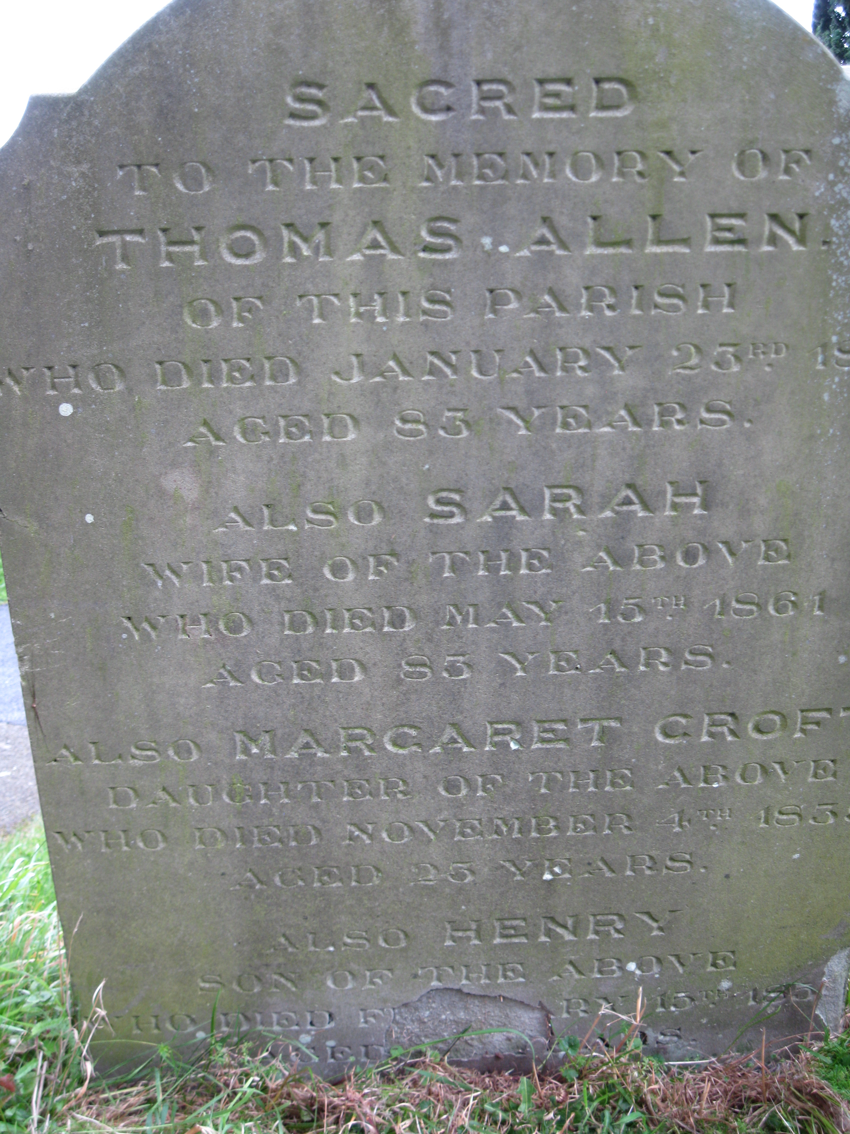 Piecing together the facts was easy with a little external help from sites such as Ancestry.co.uk and the kind assistance of fellow members of Rootschat. My line could easily be traced back to Thomas Allen and his wife Sarah, who died towards the middle of the 19th century when both were in their eighties. It was beyond them that things started getting a little tricky, as I discovered today to my dismay.