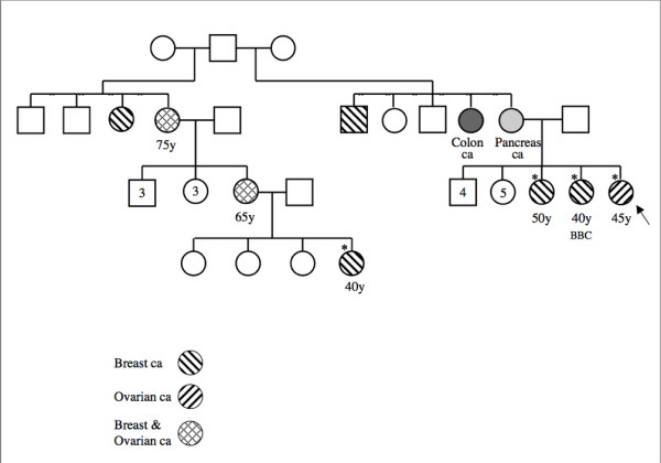 A family tree showing members of a family and the inheritance pattern of breast and ovarian cancer.
