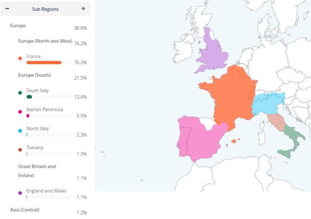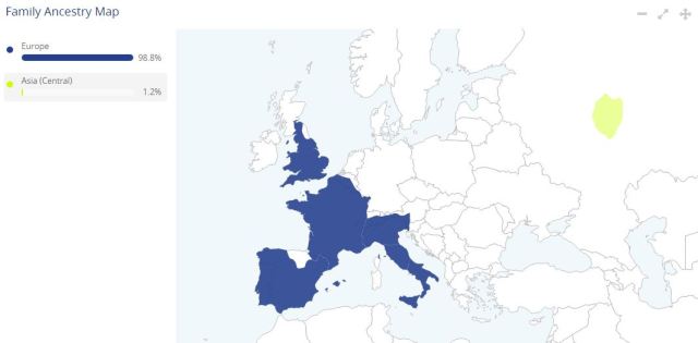 So, how did I fare with Living DNA? Well, for someone whose recent (300 years or so) ancestry is vaguely 40% Spanish, 25% British (in my case mainly West Midland English with a pinch of Welsh) and about 30% Italian, I was amazed to find a large chunk of purported French DNA (over 70%!). But then again, France is a large country, with a lot of mixed peoples, and my Italian ancestors did come from northern Italy, not that far from the French border. Then again, this may well be because the markers contained within my DNA are for the time being too different from the markers that Living DNA’s lab currently use – thus they compare somewhat differently from my other Ancestry DNA results.