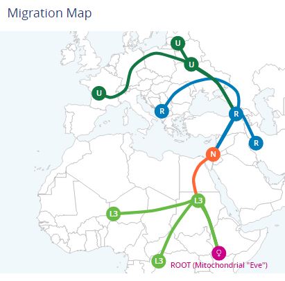 The path presumably followed by my maternal ancestors from Eve to my Mum.