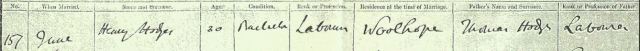 Extract of Henry Hodges’s 1872 marriage to my relative, Catherine Morris. His father’s name is given as Thomas Hodges.