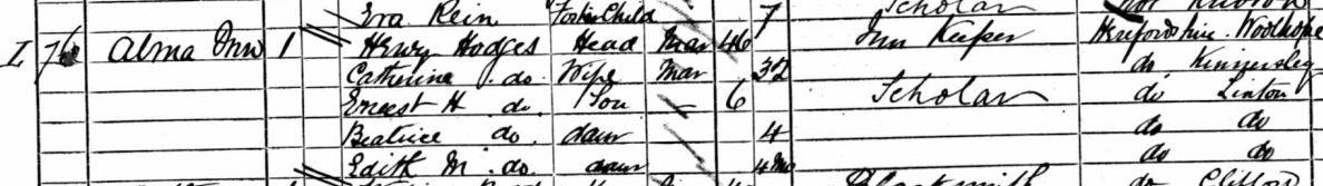 Catherine Morris, by now Catherine Hodges, living in Linton in 1881 with her husband and children.
