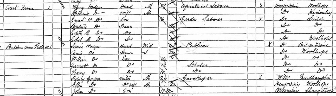 The 1891 census shows Henry Hodges and his wife Catherine living at Court Farm, in Woolhope, while Louisa Hodges lives “next door” at The Butcher’s Arms.