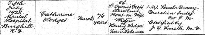 Catherine Hodges’s death certificate confirms where and when she died, her cause of death, and her status as the widow of Henry Hodges.