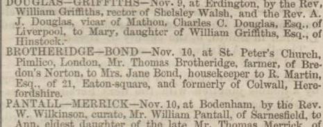 By the mid-1850’s, and within the space of a few years, Judith had not only lost her husband, but also her two sons and her only grandson. Before long she was also to lose her daughter-in-law Jane, albeit under very different circumstances. After the loss of her child and husband, Jane Bond decided to move to London, where she was employed as the housekeeper of a Mr R. Martin, of 21 Eaton Square. In 1858 the Hereford Chronicle reported how she was soon to become the wife of a Thomas Brotheridge, a farmer from Bredon’s Norton, Worcestershire; the marriage took place on 10 November 1858 at St Peter’s Church, Pimlico.
