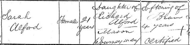 Detail from Sarah Alford’s death certificate, stating she died aged 21 after suffering some “softening of the brain” for four years.