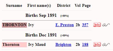 Off I went, expecting to find Ivy’s birth just as easily as I’d found her marriage to Lancelot Nash. Surely there can’t have been that many Ivy Thorntons born at the right time in Sussex, could there? Well, two results do not qualify as many by any stretch of the imagination, but one was born in East Preston in the September quarter of 1891 and the other in Brighton in the December quarter of the same year – and that was enough to throw my investigation into chaos. This was going to be a case of prove or disprove. So on I went.