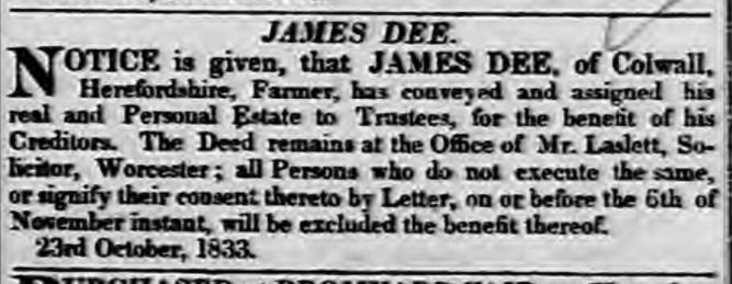 But all was not well in the home of the Dees. In fact, soon thereafter, the family ran into financial trouble. The local press of the time reported that James Dee had to convey and assign his real and personal estate to trustees for the benefit of his creditors. It is quite likely that Jane’s parents came to the couple’s rescue, and in view of subsequent evidence, it is quite possible that the Dees moved into the Horse & Groom with Edward and Sarah Allen.