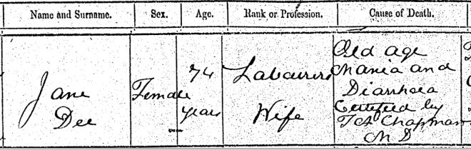 By early January 1877 Jane’s physical and mental state had deteriorated beyond hope. By the 11th a medical report stated she had been suffering from diarrhoea for a full fortnight, which combined with the ongoing “excitement” left her very feeble. Her screaming fits and general exhaustion continued as before, all of which weakened her to the point where she was literally wasting away. On the morning of 15th January, Jane Dee died, never having recovered her senses.