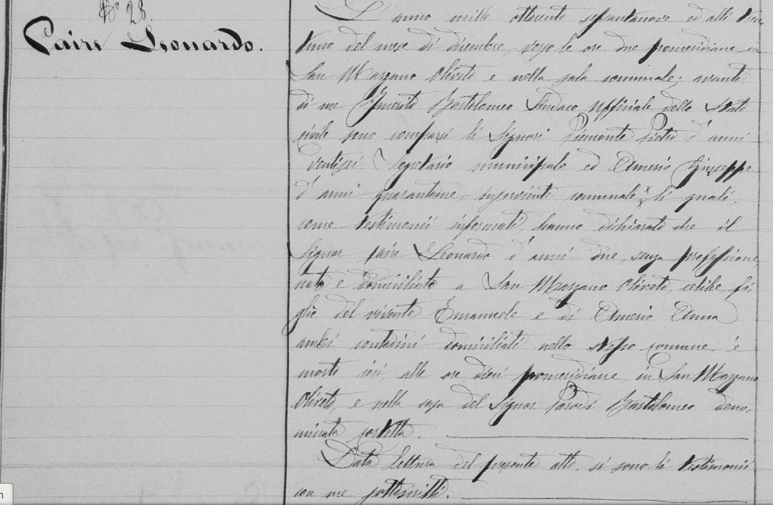 But in the absence of these vital clues, what do I know about Anna? She first crops up in December 1869, when her son Leonardo Caire passed away aged two years in the hamlet known as Regione Cortetta, within the boundaries of the parish of San Marzano Oliveto, in the Italian region of Piedmont. The record makes no explicit mention as to whether Anna and the child’s father, Emanuele Caire, were married. However, the record does seem to contain some contradictory information: it clearly states that the unfortunate child had been born in the same parish; and yet, no baptism for him exists – in San Marzano Oliveto at least. This may suggest he was in fact born elsewhere, as I’ll explain shortly.