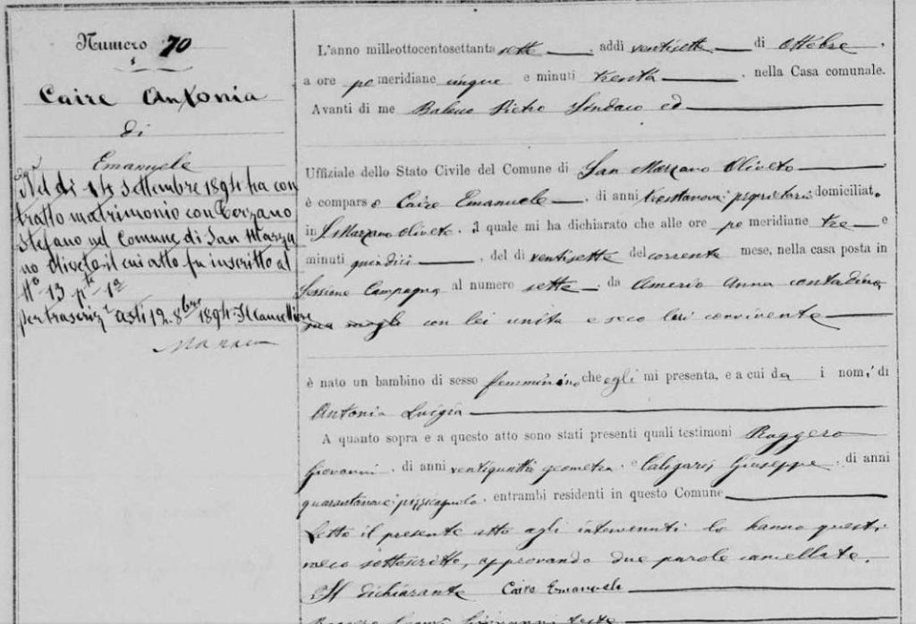 In 1872 Anna gave birth to a daughter called Carolina Clementina, who was registered as illegitimate in the local registry office. After her birth, Anna would produce three more children (Giacomo in 1875, Antonia in 1877 and a second Leonardo in 1879), all of whom were registered as either illegitimate, or otherwise recorded as children of the unmarried couple Emanuele Caire and Anna Amerio.