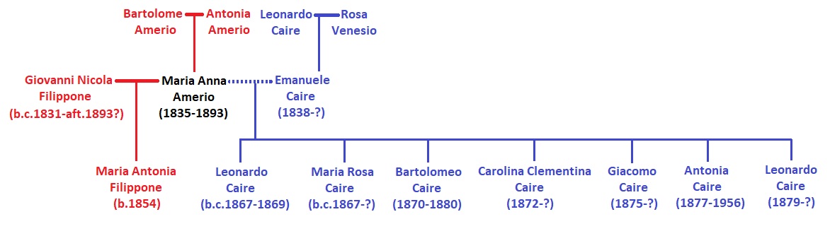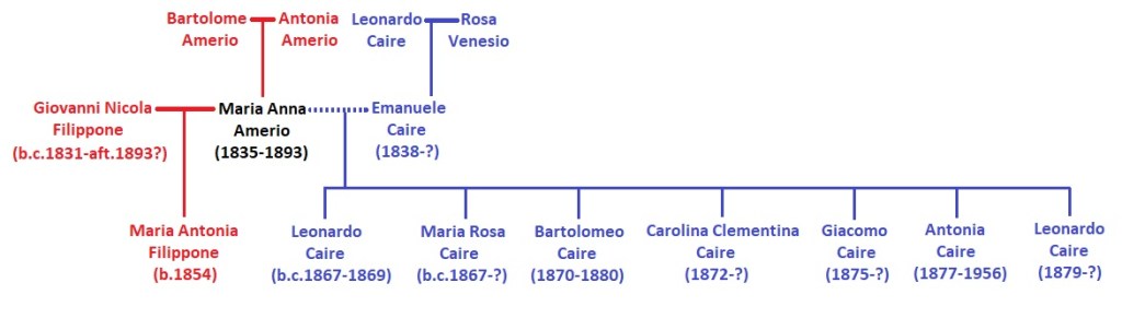 So, where to from here? First, I need to prove beyond a shadow of a doubt that there are no other Anna Amerios who died between 1887 and 1894 (the church archives should soon provide an answer to that question). Secondly, I need to prove the birth of the two children born to Emanuele and Anna in Nizza Monferrato in the late 1860s. It would of course be useful to find a reference to Nicola Filippone’s death after 1893, which would indeed prove why his wife never married Emanuele Caire, but as he seems to have disappeared from the picture after 1854, I can’t say I’m holding my breath.