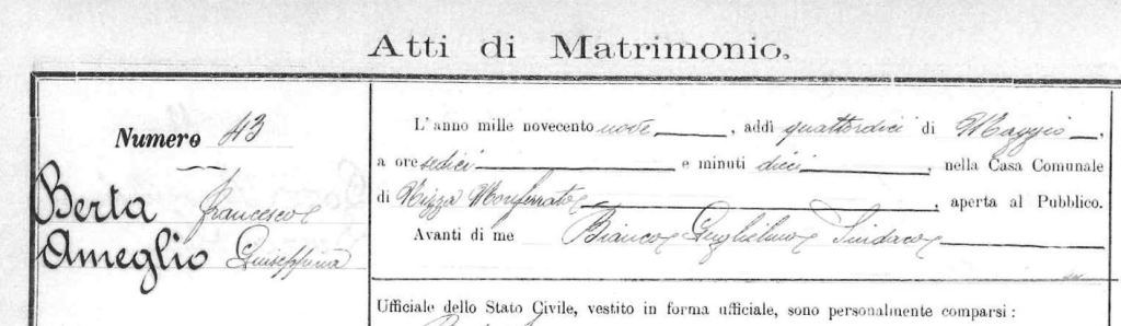 Vincenzo’s death certificate states that he died in 1917 at the age of 58. Margherita is still mentioned as his wife, though of course the couple had not cohabited for many years. There are no further clues as to the latter part of Vincenzo’s life, but two names leapt off the page instantly when I first saw the record: they refer to the people who went to register the death. On the one hand, 33-year-old Giuseppina Ameglio (same surname as Vincenzo’s) and 33-year-old Francesco Berta, whose link to Vincenzo seemed a total mystery.