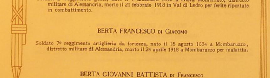 The fact that I knew that Giuseppina’s husband predeceased his wife, but was still alive in 1917 when his father-in-law died (and when his third son was born), I decided to check the online database of Italian soldiers who died as a result of the First World War. The chances of Francesco Berta being on it were slim, but Italy’s casualties during the war were extremely high and, at 33, Francesco would have still been young enough to be sent to the front. My suspicions were sadly confirmed when I found his name listed among the war dead: he did not die at the front, however, but in his hometown Mombaruzzo. His death, which occurred in April 1918, was due to “illness”, likely contracted as a direct consequence of the war. So, poor Giuseppina not only lost her beloved father in 1917, but she was also left a widow a year later – and with three young mouths to feed too!