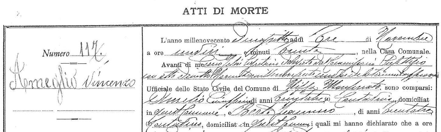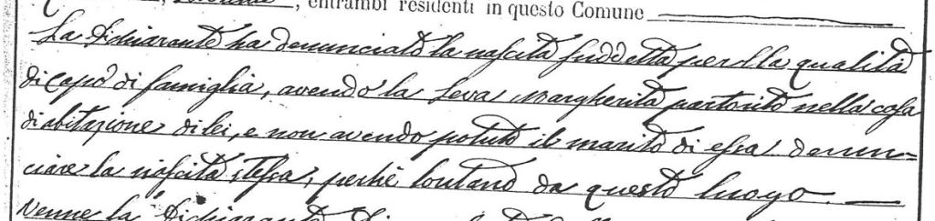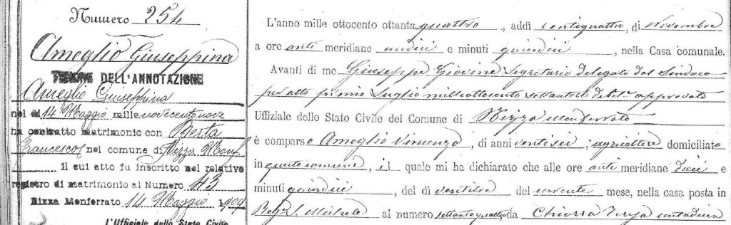 A few more requests addressed to the civil registry office helped me to fill in the remaining gaps: Vincenzo and his first wife Teresa were married in early 1884; before the year was out, Teresa had given birth to the couple’s daughter Giuseppina. Sadly, Teresa died less than two weeks later – one can only assume, as a consequence of childbirth. Vincenzo was therefore left a widower, emotionally bereaved, still young at 27 and now with a baby to look after. It should not be surprising, therefore, that just over a year later he decided to remarry.