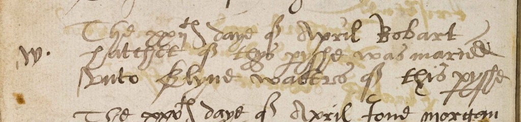 Indeed, the surviving parish records for Shawbury include the baptism, on 26 October 1583, of a Richard Hatchet (sic), son of Robert Hatchet. The name of Richard’s mother is not mentioned on the baptism entry, but a marriage between a Robert Hatchett and Eline Waters on 22 September 1577 would suggest that Elyne was Richard’s mother. Perhaps more conclusively, the names of Richard’s godparents are both mentioned on his baptism certificate, and his godfather is recorded as being Robert Waters, the same surname as Elyne’s. Richard was not the couple’s only child, for Robert and Elyne also had at least one other daughter, Margery, who was baptised in May 1579.