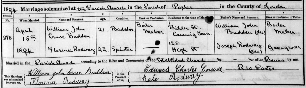 And yet, not everything appears to have been well in the Rodway household, for 1891 would be the last census in which Joseph William would be recorded living with his wife and children. When his second daughter Florence married in 1894, her father was recorded as “dec[eased]” on the marriage certificate. On the other hand, while the marriage certificate of his elder daughter Kate in 1896 does not say as much, the 1901 census clearly states that his wife Catherine – by then living back in Mile End Old Town with her children Joseph William, Maurice and Jessie – was a widow. All these facts would therefore suggest that Joseph William had died sometime between 1891 and 1901, when the respective decennial censuses were taken, and more probably before 1894, when his daughter Florence got married. And yet, despite trying various spelling alternatives, there is not a single trace of a burial nor an entry of death that fits the fill, either on FreeBMD or on the GRO index, nor on any of the major genealogical websites. What happened to Joseph William Rodway?