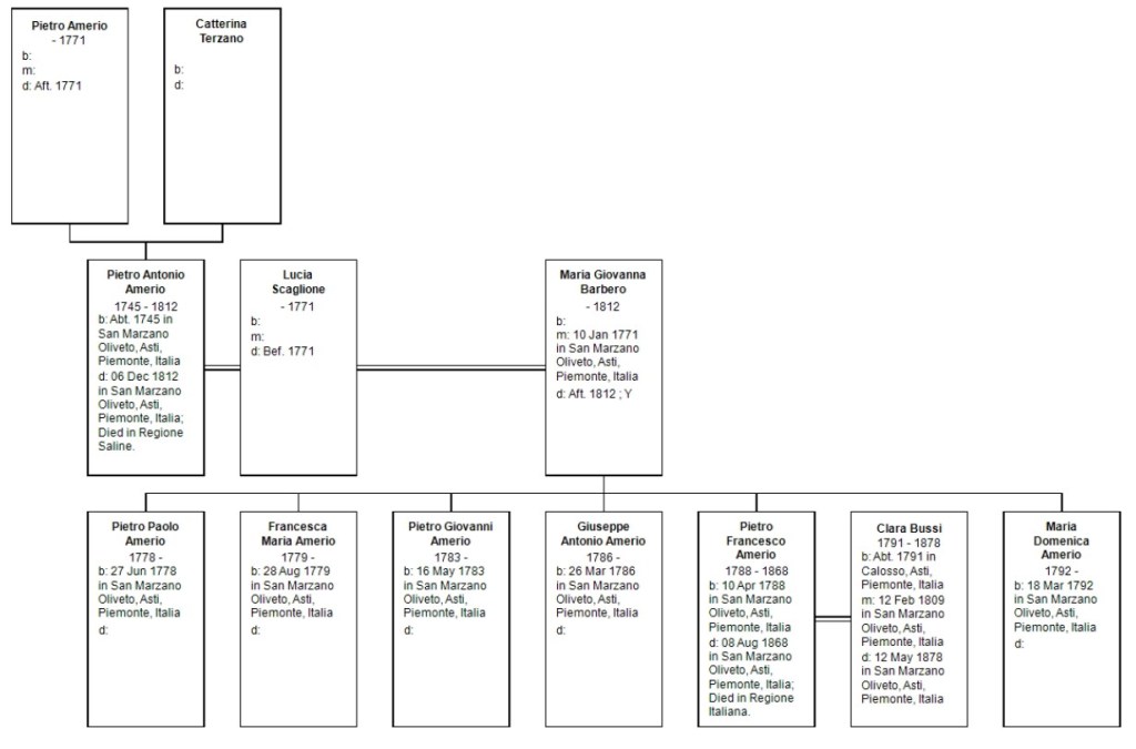 Rosa Maria’s father, Pietro Francesco Amerio (1788-1868) was, as I already knew, the son of a Pietro Antonio Amerio (c.1745-1812) – son of Pietro Amerio – and of his second wife Maria Giovanna Barbero – herself the daughter of Pietro Francesco Barbero, after whom Rosa Maria’s father was presumably named. For some time I have known that Pietro Antonio and Maria Giovanna were married in 1771, and that he had been married at least once before (when, and for how long, I do not know); whether there were any children born to that earlier marriage remains a mystery for now. However, considering that my ancestor’s union to Maria Giovanna took place in 1771, and that the couple’s son was born in 1788, chances are there must have been quite a few children born to Pietro Antonio’s second marriage to Maria Giovanna Barbero.