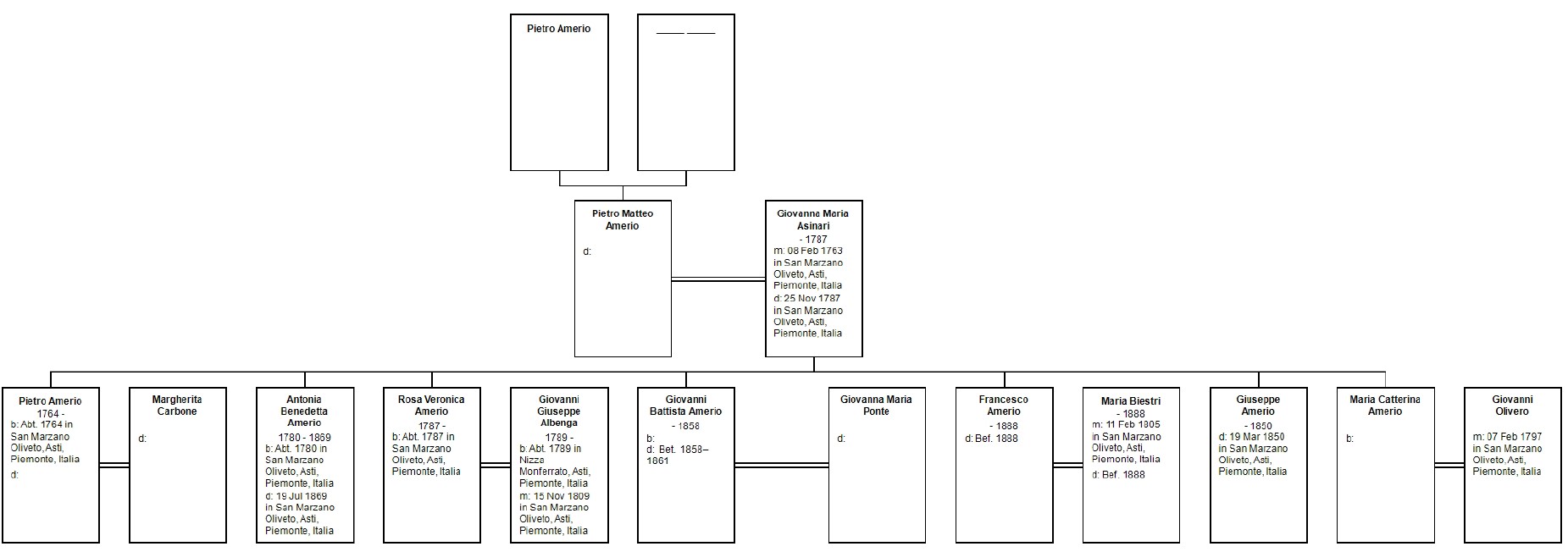 Through my own research some time ago, I have already identified some family members of Matteo Amerio (his full name was, unsurprisingly, Pietro Matteo Amerio). I knew that he married in 1763, so he was probably about the same age as Pietro Antonio (remember that the latter had been married once prior to 1771). As they were both fathered by a man called Pietro Amerio, in view of their repeated godparenting tradition I think it highly likely that they were brothers – a theory reinforced by the fact that Pietro Antonio’s mother was called Catterina Terzano, the same name given to one of Pietro Matteo’s daughters (see family tree below).