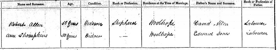 I have ordered a certificate for a possible marriage, that of Robert Allen and Ann Jones, registered in Ledbury registration district in 1850, but alas, it proved to be a dead end: this marriage is for a 50 year-old shepherd, the son of a David Allen from Woolhope. This is clearly not my Robert Allen.