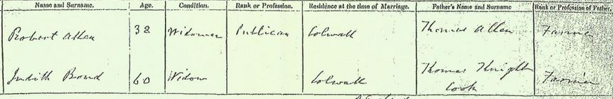 I can only guess the reason why she and my distant uncle Robert Allen knew each other or why they decided to get married, he being closer in age to Judith’s late sons. Perhaps he was a friend of theirs and took pity on the helpless lonely widow, and they mutually agreed to look after each other in their later years. As Robert was a labourer-turned-publican, and Judith doesn’t seem to have been particularly well off, I do not believe there was any financial interest on either party.