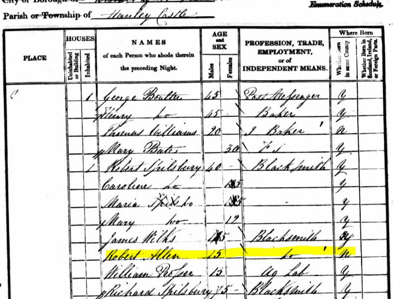 Robert’s whereabouts between 1839 and 1858 also remain a mystery. There is a good chance he is the same Robert Allen recorded as a blacksmith on the 1841 census (see caption below), living in Hanley Castle, which is in Worcestershire but very close to Colwall. He is noted as “not” born in the county, which would fit, and perhaps significantly, he is living with the Spilsbury family (a Henry Spilsbury, born in Hanley in around 1805, would go on to marry Robert’s sister Anne Maria in 1844). Unfortunately, as marital status is not included in the census form that year, there is no way of knowing if Robert was married, single or even widowed by then. There is no N. Allen living with him at the time, so I can only conclude Robert was probably unmarried at the time.