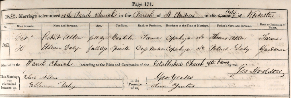As is often the case in such situations, it helps to explore alternative locations as to where a specific event may have taken place. Not long ago, Ancestry made available digitised images of parish records of the county of Worcestershire. A simple search of a marriage for Robert Allen revealed an interesting result: the 1852 marriage of Robert Allen, a farmer, son of Thomas Allen, also a farmer, to Ellinor Daly, a dress maker, daughter of Patrick Daly, a gardener. The marriage took place in the city of Worcester, and it was short lived as well as childless: Eleanor (sic) Allen died in Colwall the following April. Not only does the place match Robert’s hometown, but his signature on the marriage register matches that of his second marriage to Judith Bond in 1858.