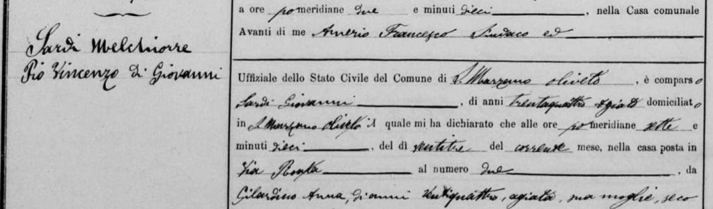 Noting the huge number of branches my Italian family tree has, I decided to create this One Place Study not just to learn about my own family’s connection to the village, but the story of all those other families who at one time or other lived in San Marzano Oliveto. Many of them of course have a direct blood link to my family, while others remain disconnected from my tree – though given the continuous repetition of some surnames, and the relatively small size of the village, I can only conclude that most sanmarzanesi families indeed share common ancestors sooner or later.